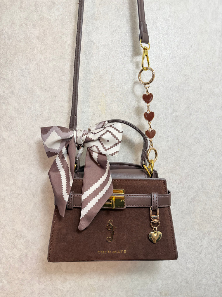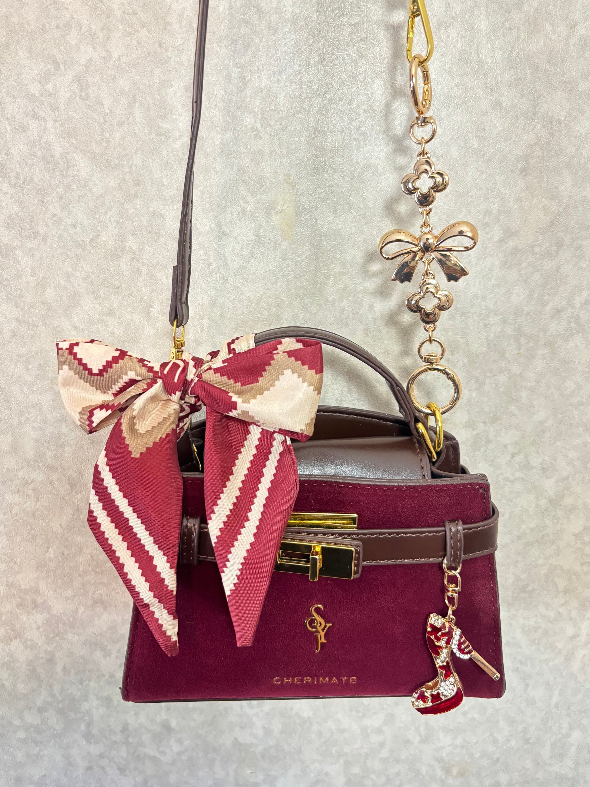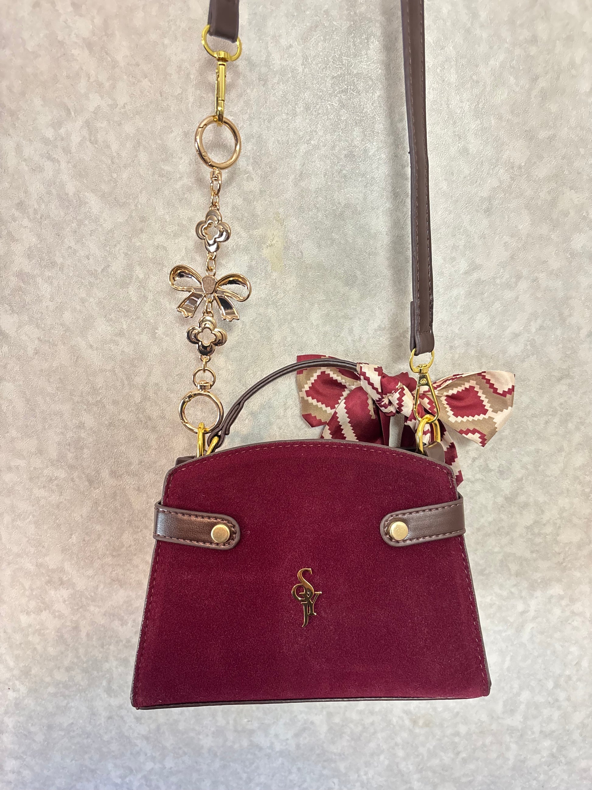 Turn every entrance into a statement with The Rouge Muse Bag—a rich wine-toned beauty designed for the woman who loves elegance with personality. Wrapped in a luxe suede finish and accented with warm brown trim, this piece blends timeless structure with playful charm. Finished with gold hardware, a silk statement bow, and delicate luxe charms, this bag was made to stand out effortlessly.